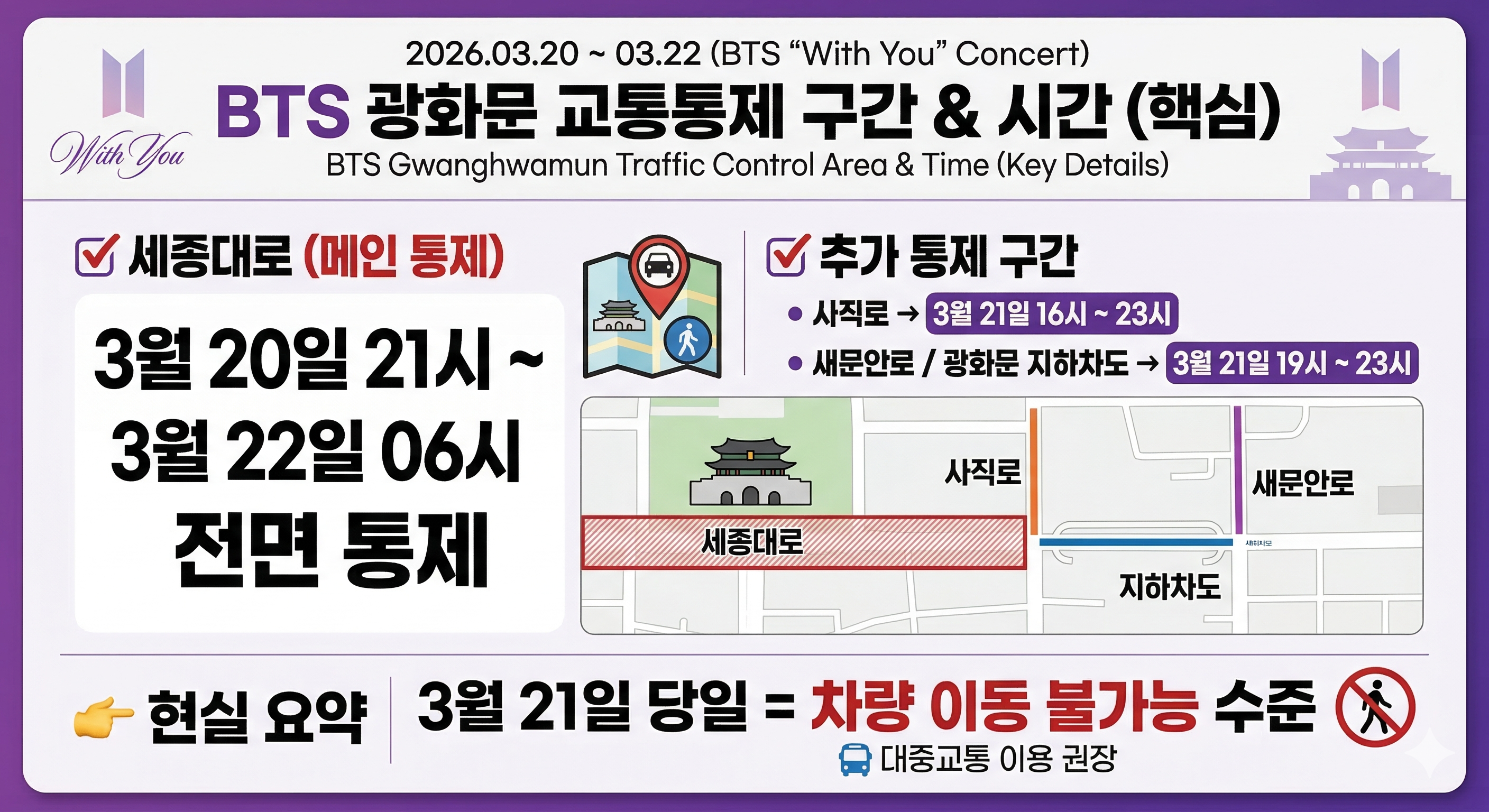 BTS 광화문 교통통제 정보를 찾는다면 가장 중요한 건 통제 구간, 지하철 무정차 시간, 31개 빌딩 통제 내용, 실제 이동 가능 여부입니다.