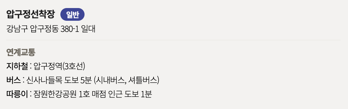 - 무료 셔틀버스: 신사나들목 인근 ↔ 압구정 선착장 간 운행, 배차 간격 약 30분