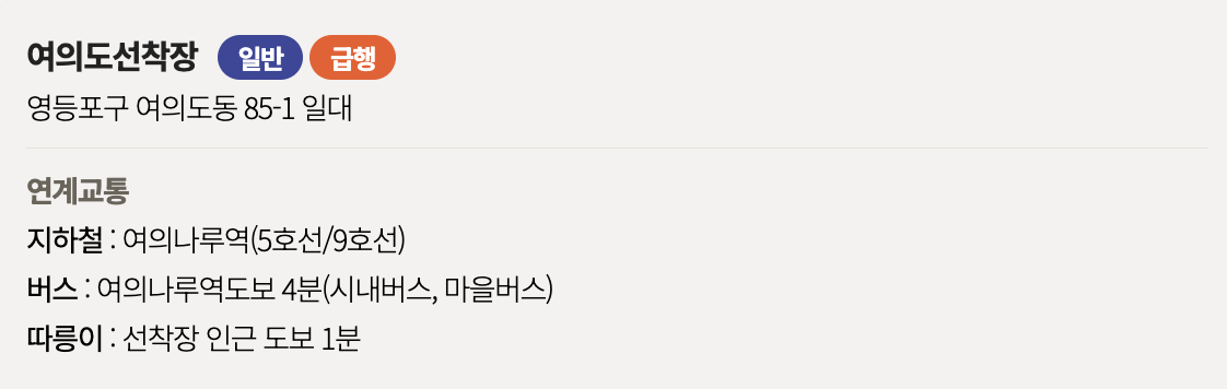 - 따릉이: 여의도 한강공원 내 따릉이 대여소 운영 또는 추가 설치 예정