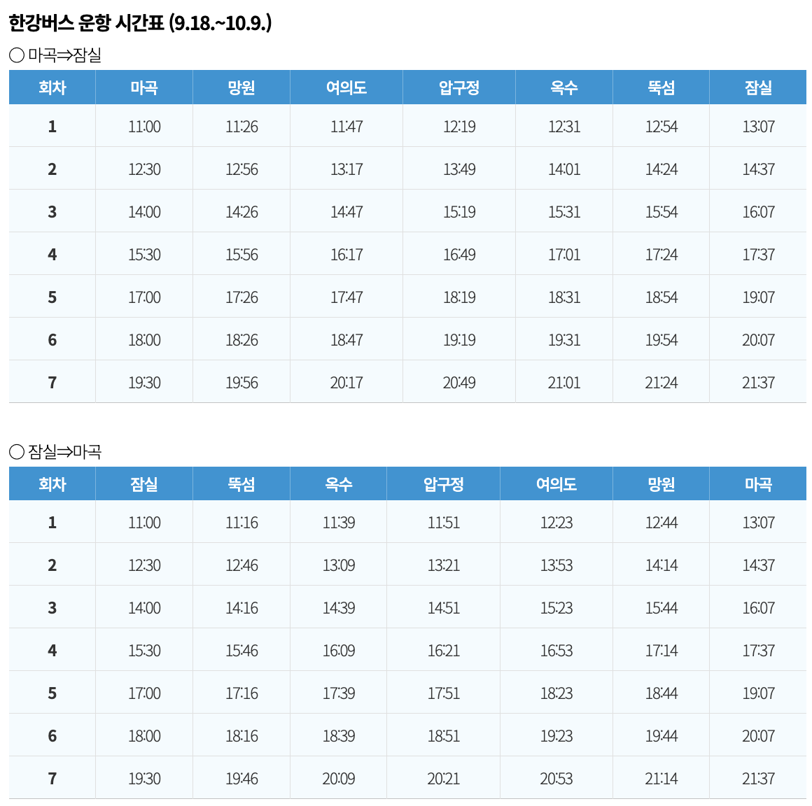 - 따릉이: 선착장 인근 도보 3분 이내에 따릉이 대여소 설치, 자전거 반입 가능
