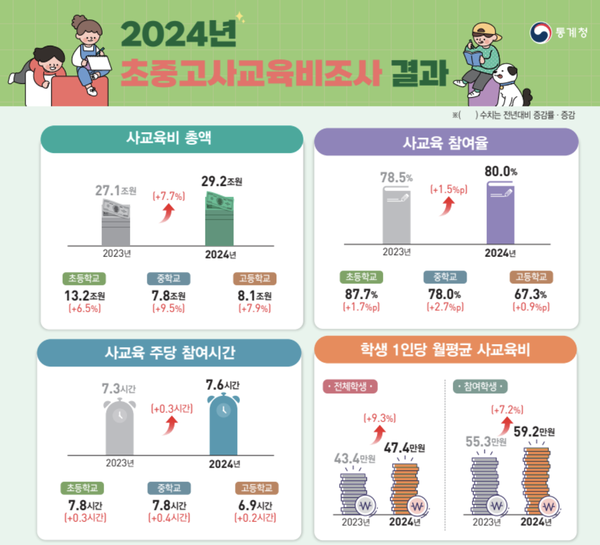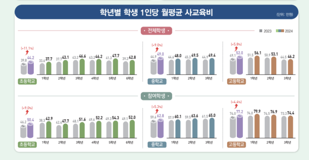 많은 부모들이 ‘필요한 만큼만’ 사교육을 시킨다고 말하지만, 그 ‘필요한 만큼’의 기준이 점점 모호해지고 있습니다. 교육청 통계에 따르면, 2024년 한 해 동안 초중고 학생의 사교육비는 무려 28조 9,000억 원을 넘었다고 합니다. 초등학생만 해도 1인당 월평균 51만 원 이상을 사교육에 사용하고 있다는 통계가 나왔습니다.