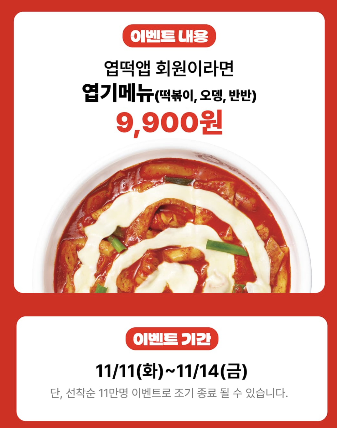 - 참여 조건: 엽떡앱 회원 / 선착순 11만 명 한정