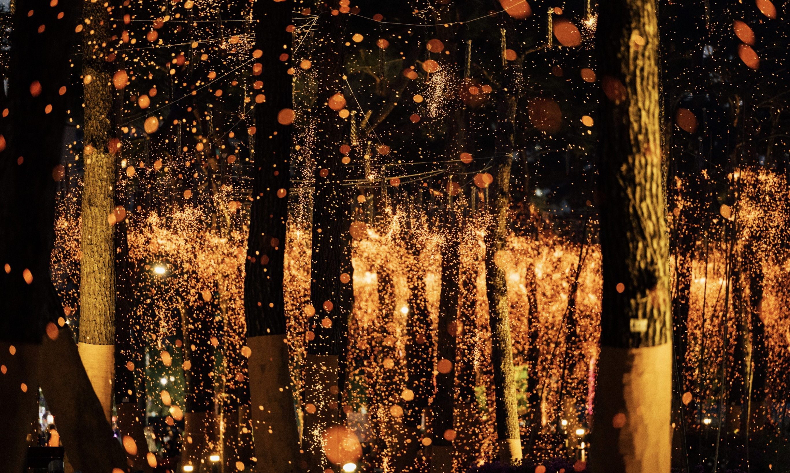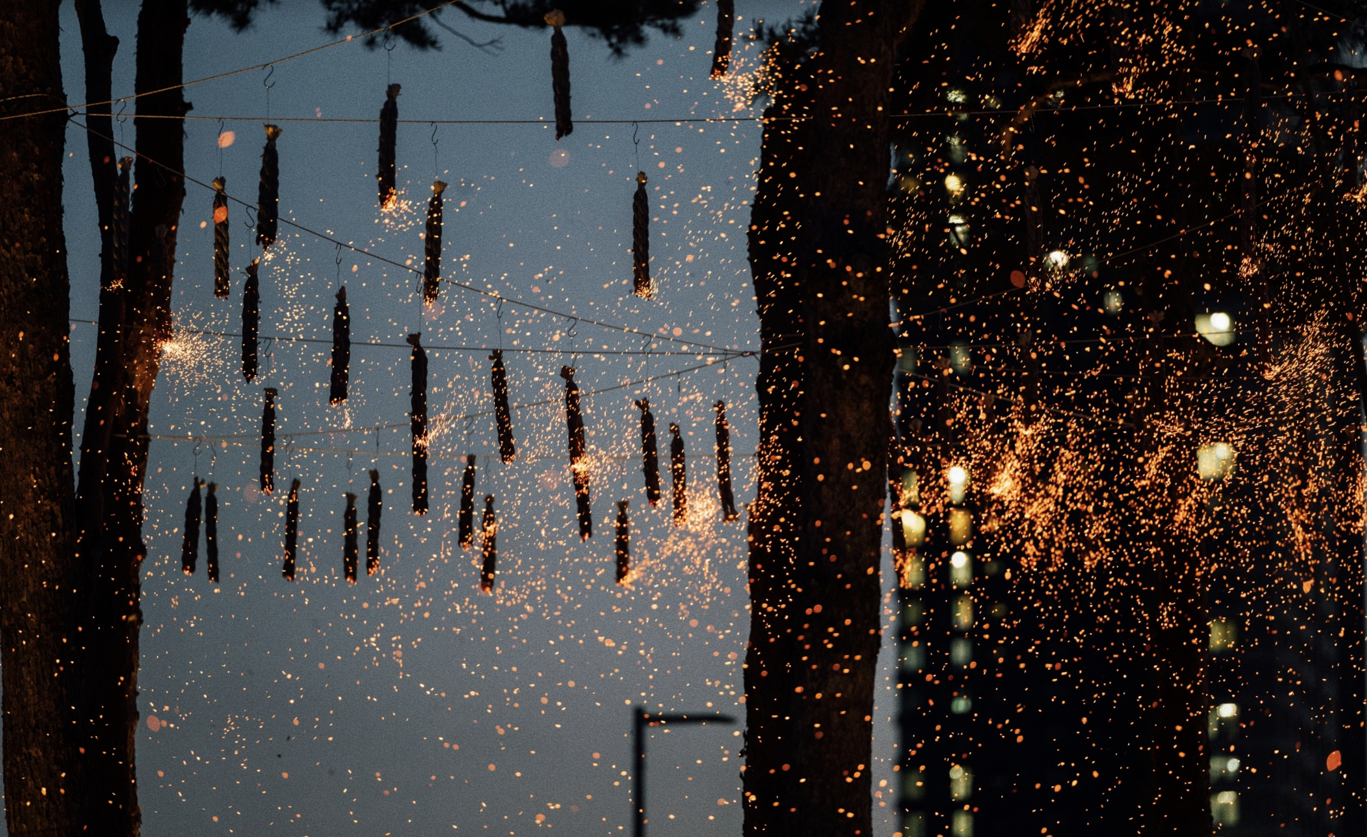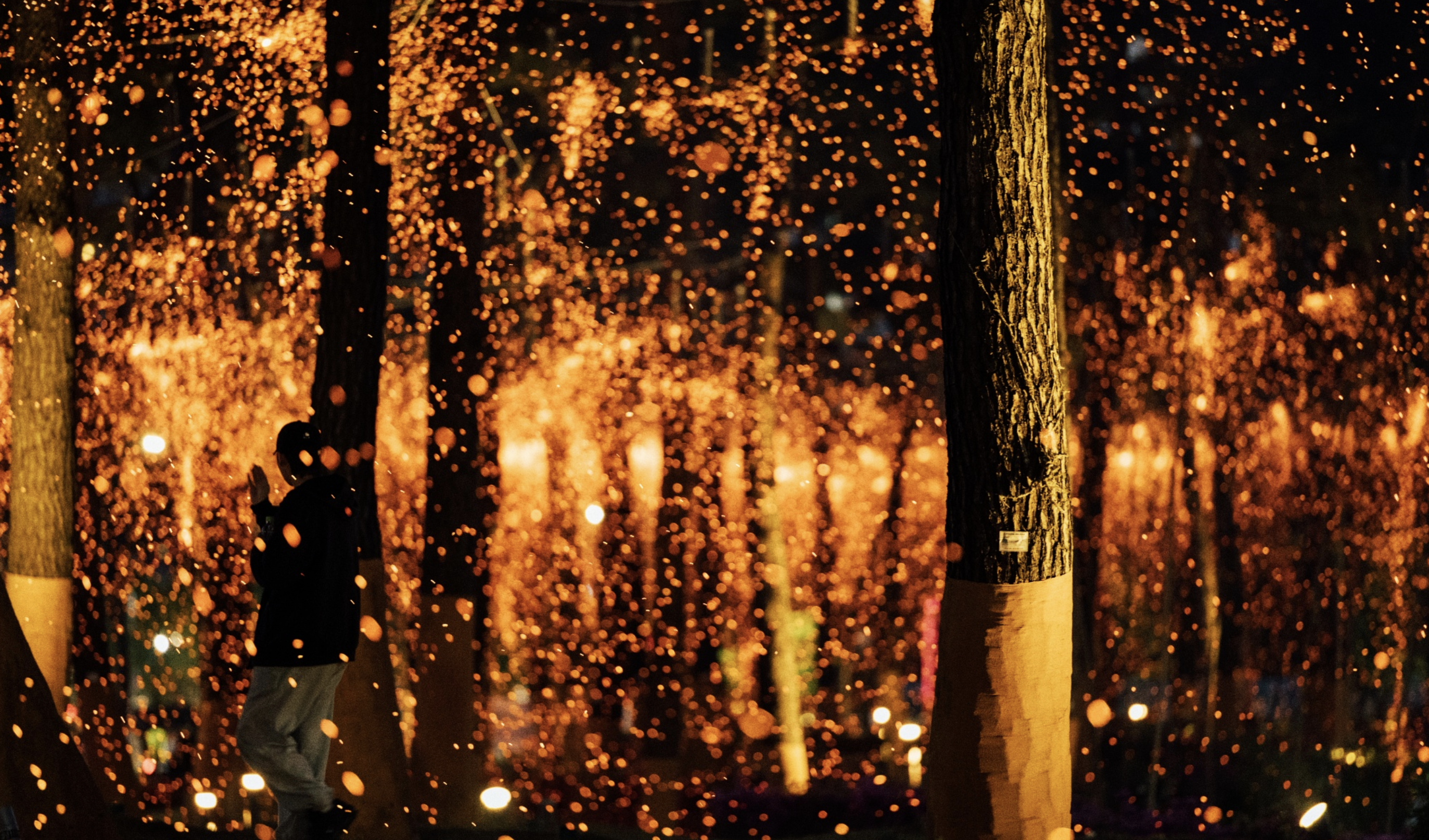 수천 개의 불씨가 밤하늘을 수놓으며 마치 꽃잎이 떨어지는 듯한 장관을 연출합니다.