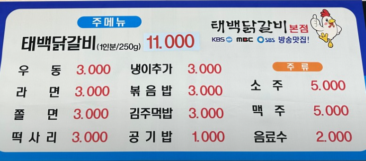 - 메뉴: 태백닭갈비 등