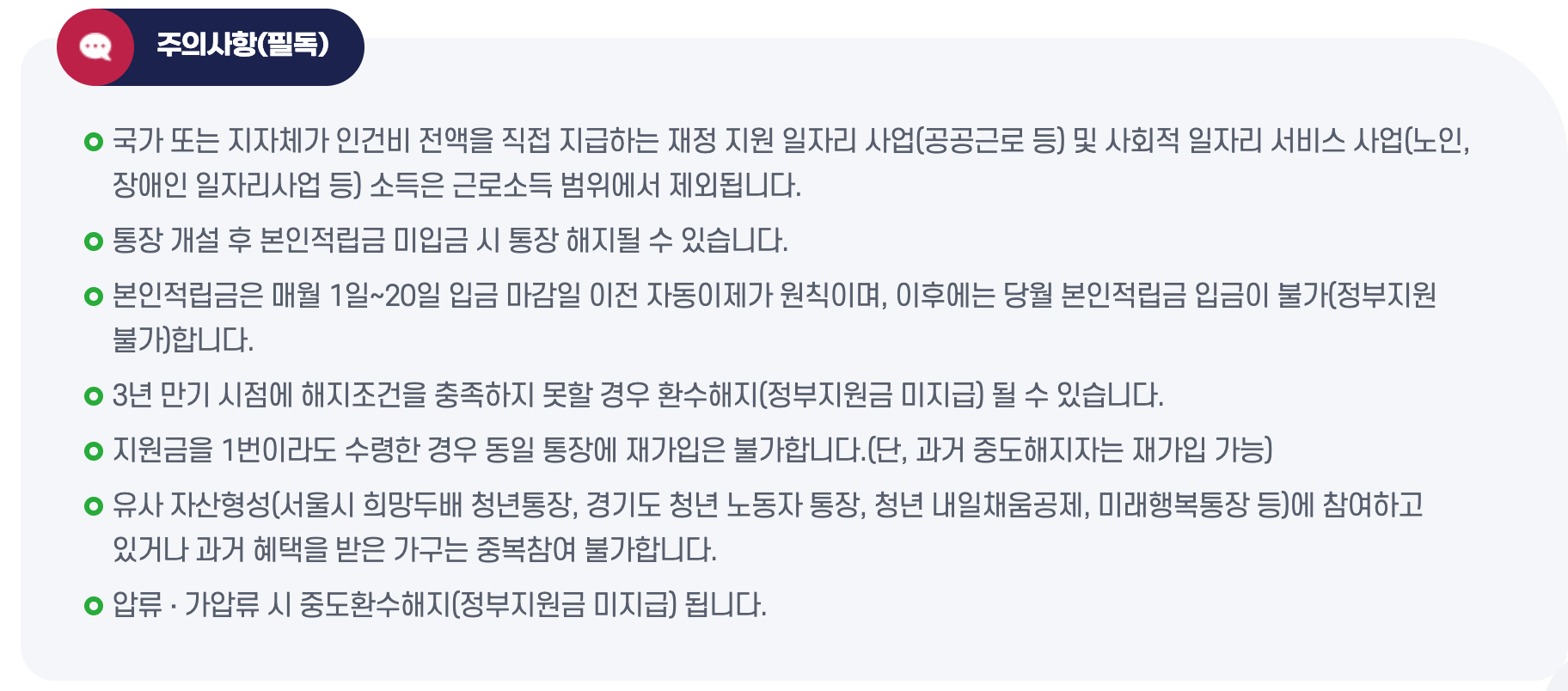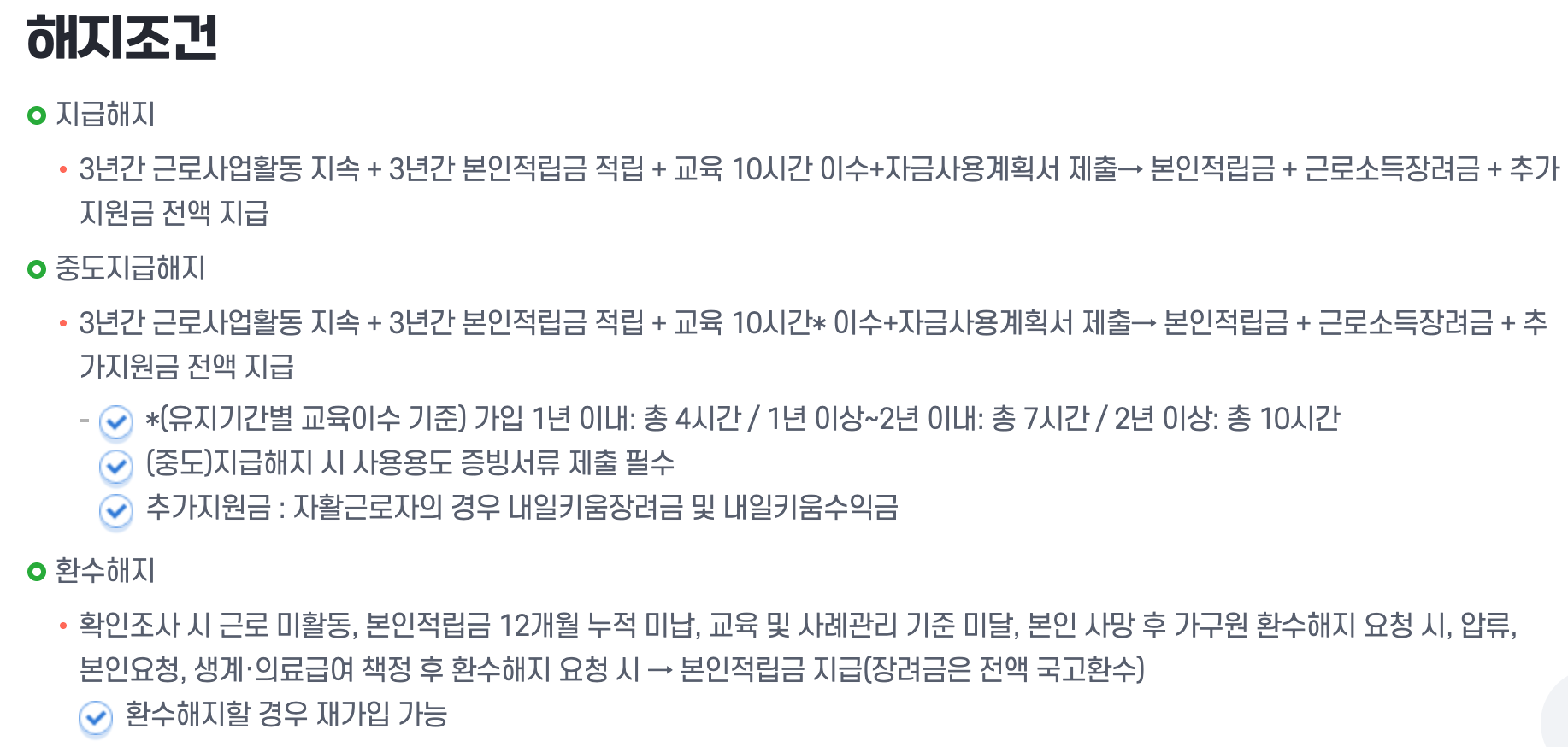 단순한 저축이 아닌, 근로 활동 유지 + 교육 이수 + 자립 계획 수립 등의 조건을 충족해야 최종 지급받을 수 있는 제도입니다.