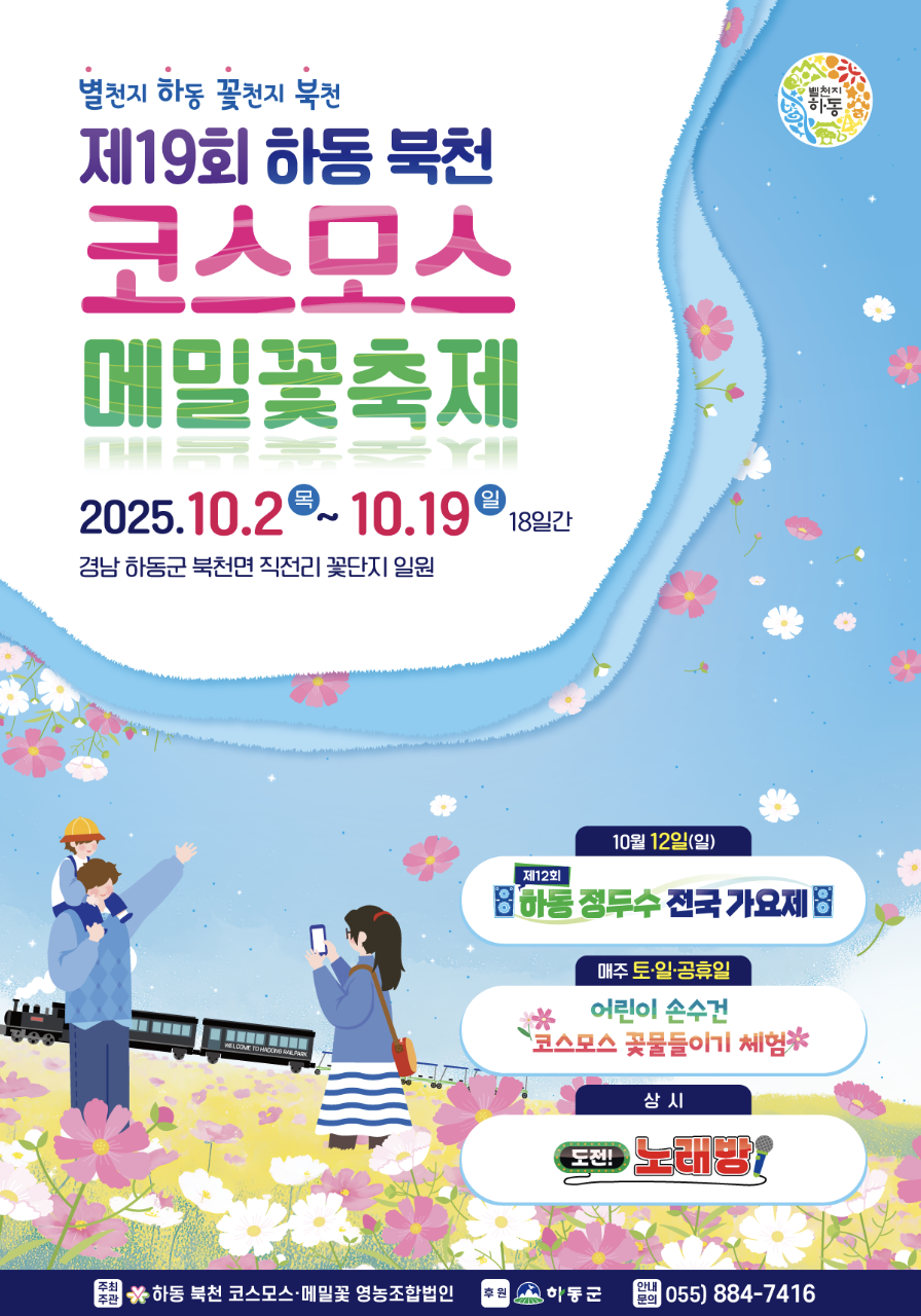 A. 2025년 하동 북천 코스모스·메밀꽃 축제는 **10월 2일(목)부터 10월 19일(일)**까지 열립니다. 총 18일간 진행되며, 주말에는 관람객이 많으니 평일 방문을 추천합니다.