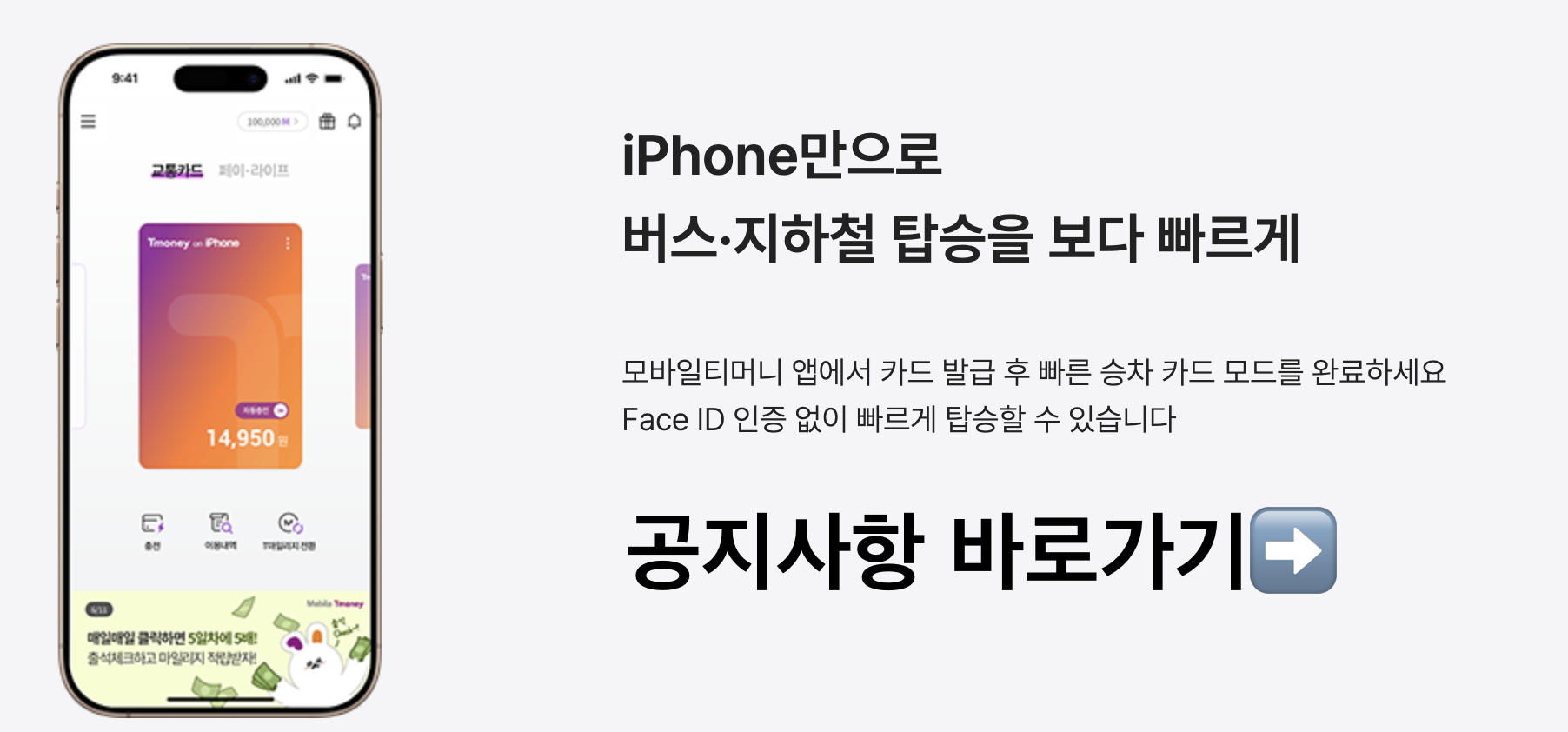 최근에는 애플페이 안에서도 교통카드 기능이 지원되어, 티머니와 연동해 버스나 지하철에서도 사용할 수 있습니다.