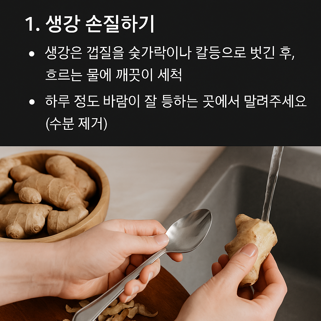 - 생강은 껍질을 숟가락이나 칼등으로 벗긴 후, 흐르는 물에 깨끗이 세척