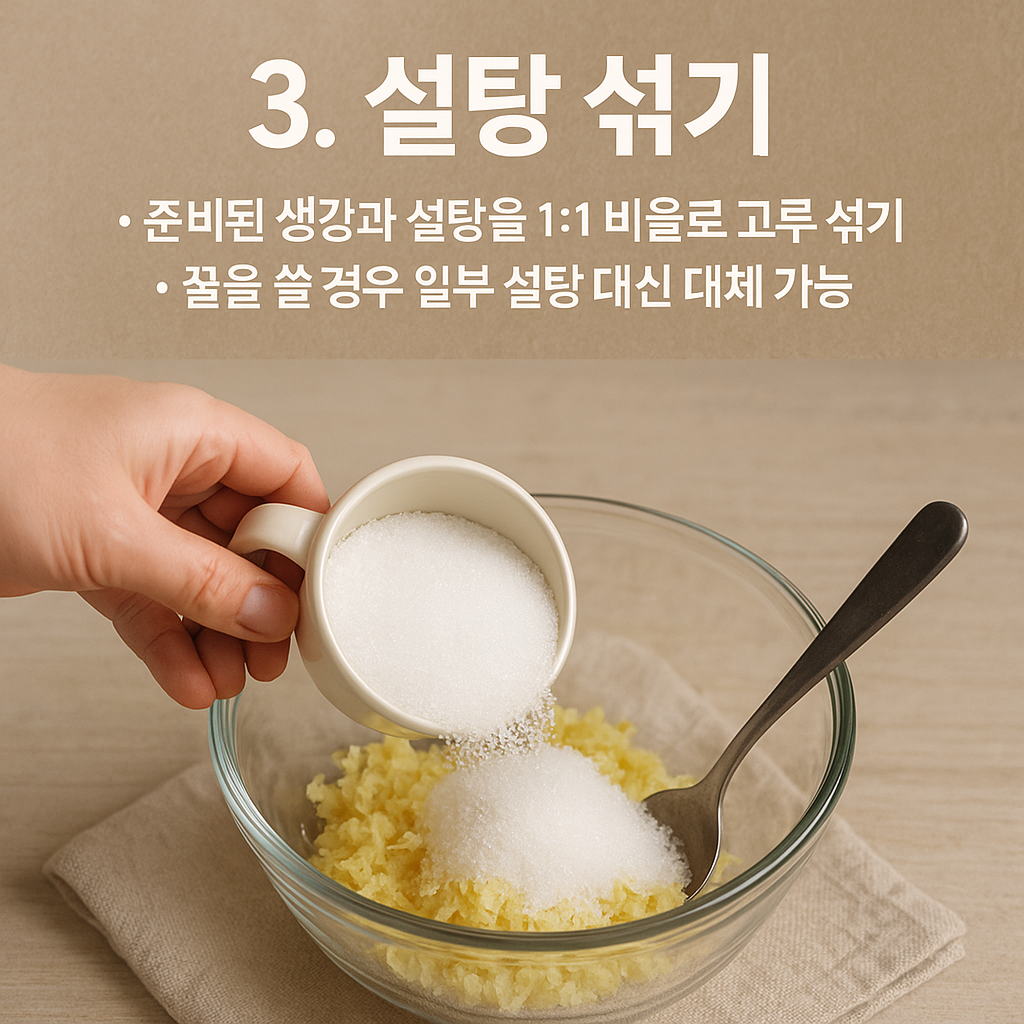 👉 생강과 설탕은 1:1 비율이 기본이에요!※ 기호에 따라 설탕을 줄이고 꿀을 일부 넣어도 좋아요.