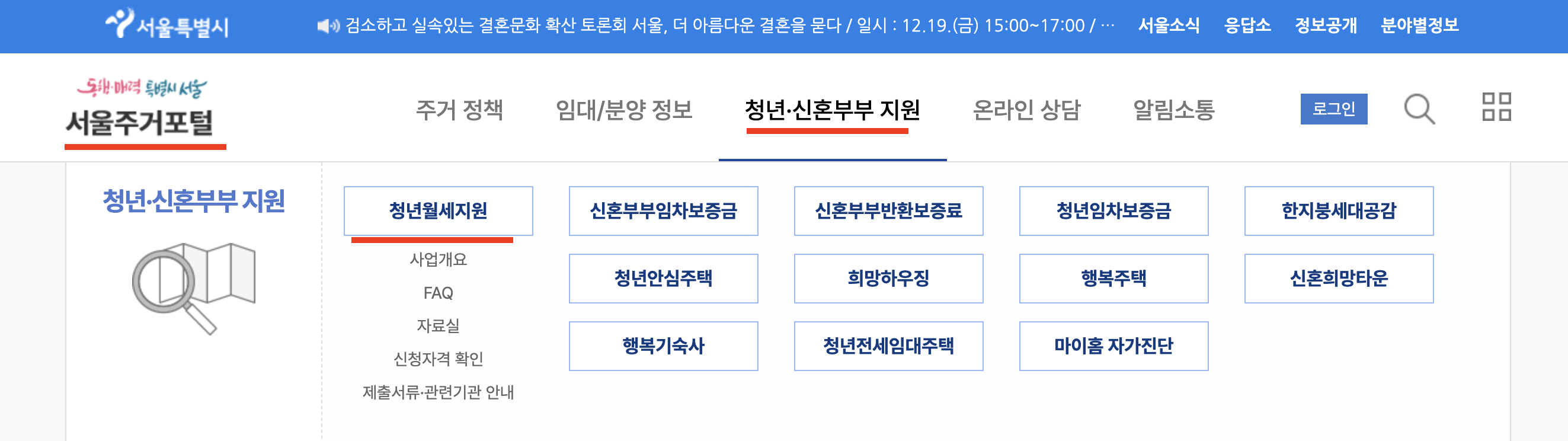(경로: 청년신혼부부지원 → 청년월세지원 클릭 후 알림 설정)
