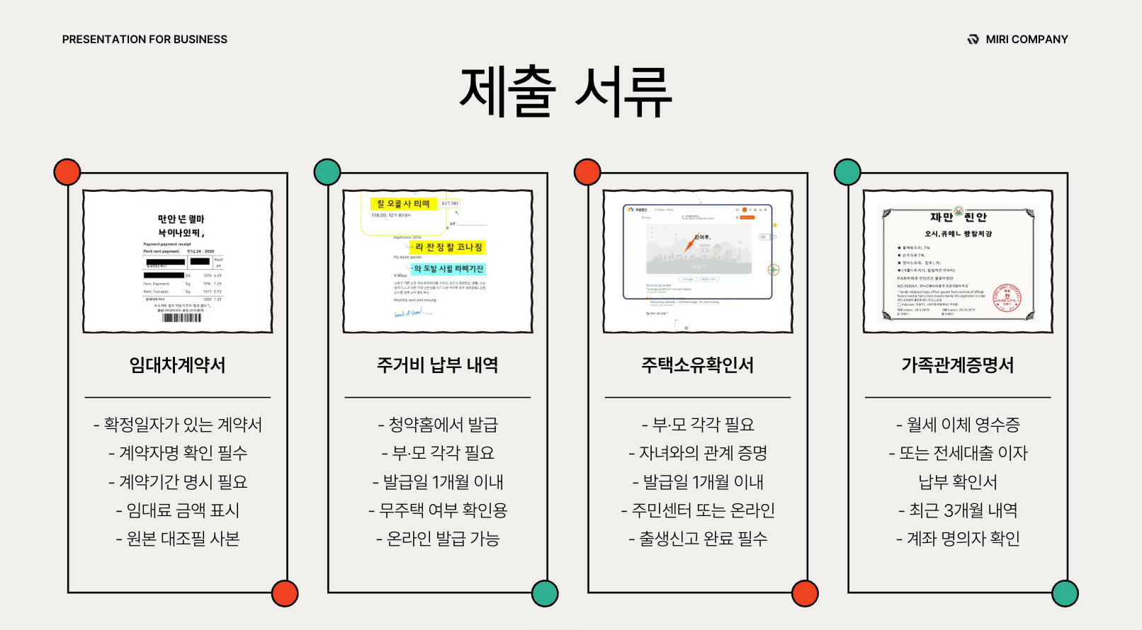 - 주거비 납부 내역 (월세 이체 영수증 or 전세대출 이자 납부 확인서)