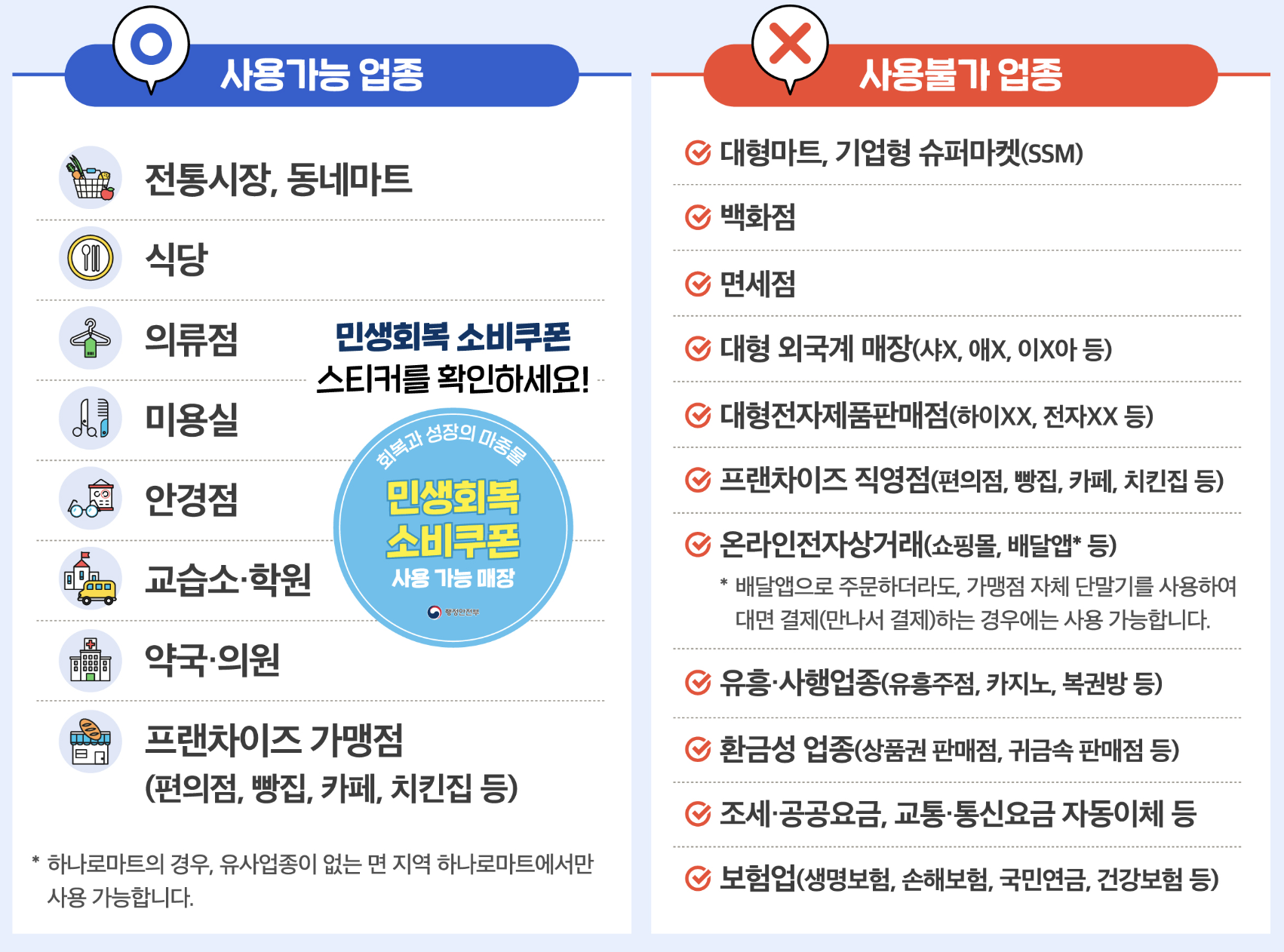 쿠폰 사용이 가능한 매장에는 정부에서 지정한 ‘민생회복 소비쿠폰 사용 가능 매장’ 스티커가 붙어 있습니다. 매장 입구, 계산대 부근에서 확인해 보세요.