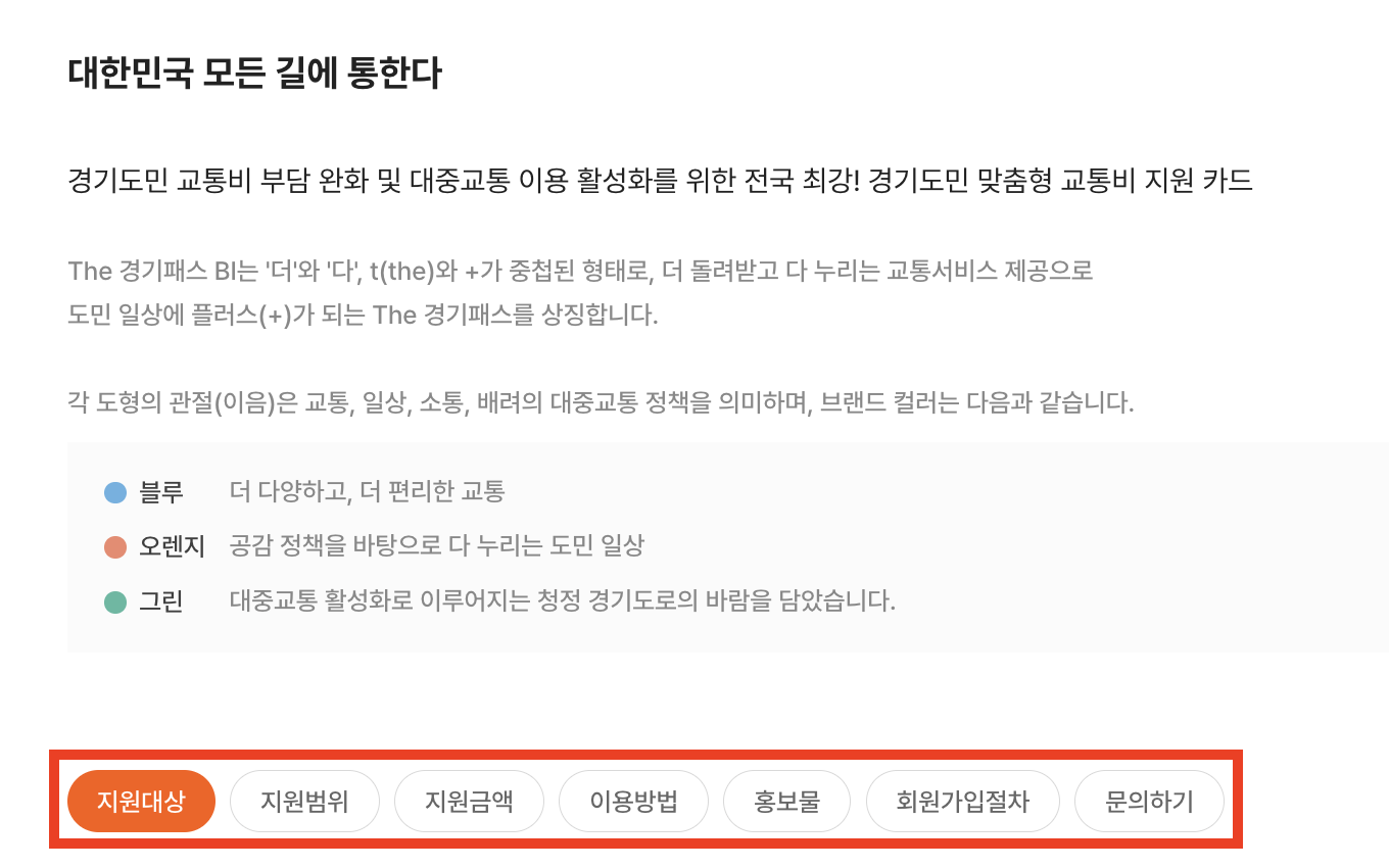 - 경기지역 전용 대중교통 환승 할인 정책을 포함한 복합 카드