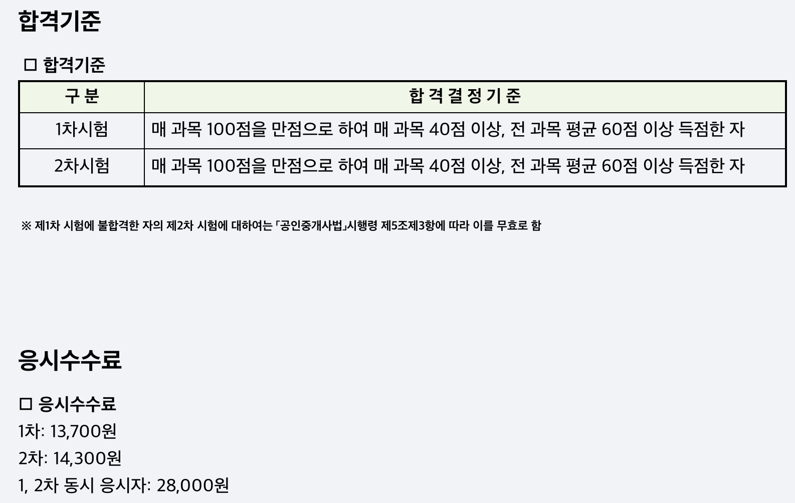 | 합격 기준 | 과목당 40점 이상 + 평균 60점 이상 |