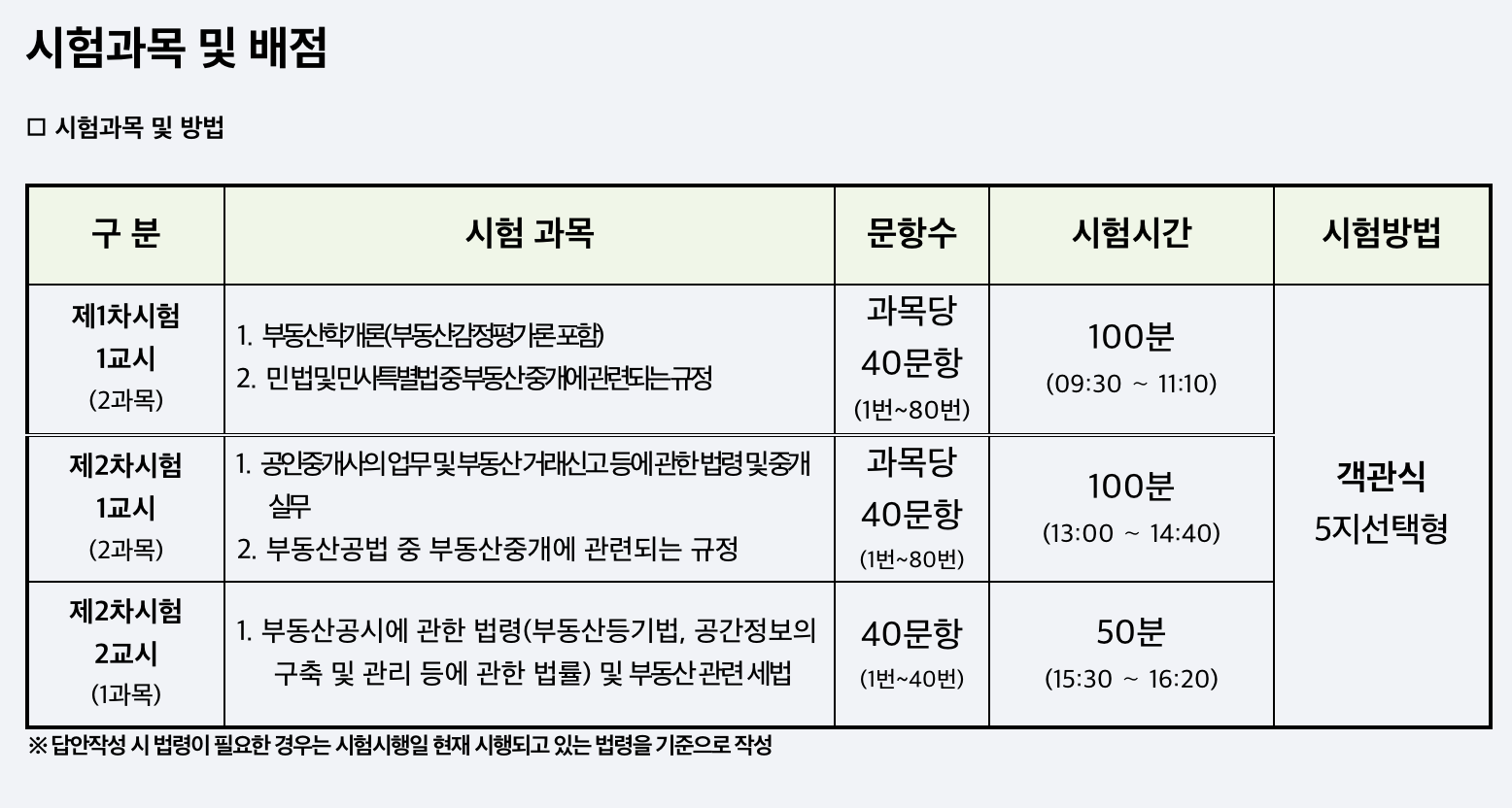 | 1차 | 1교시 | 부동산학개론 / 민법 및 민사특별법 | 09:30 ~ 11:10 | 100분 |