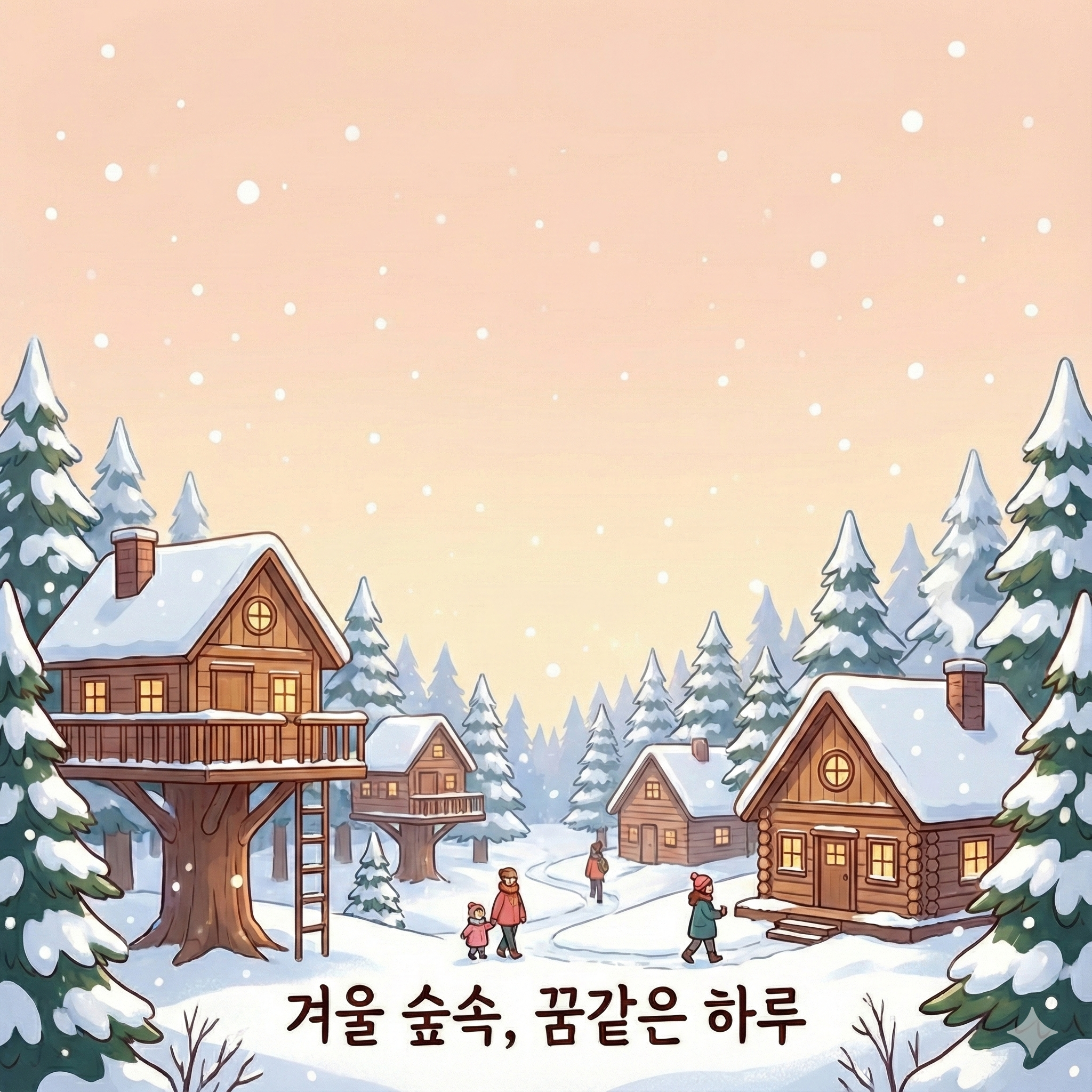 눈 덮인 숲 속에 포근히 자리 잡은 통나무집 감성,