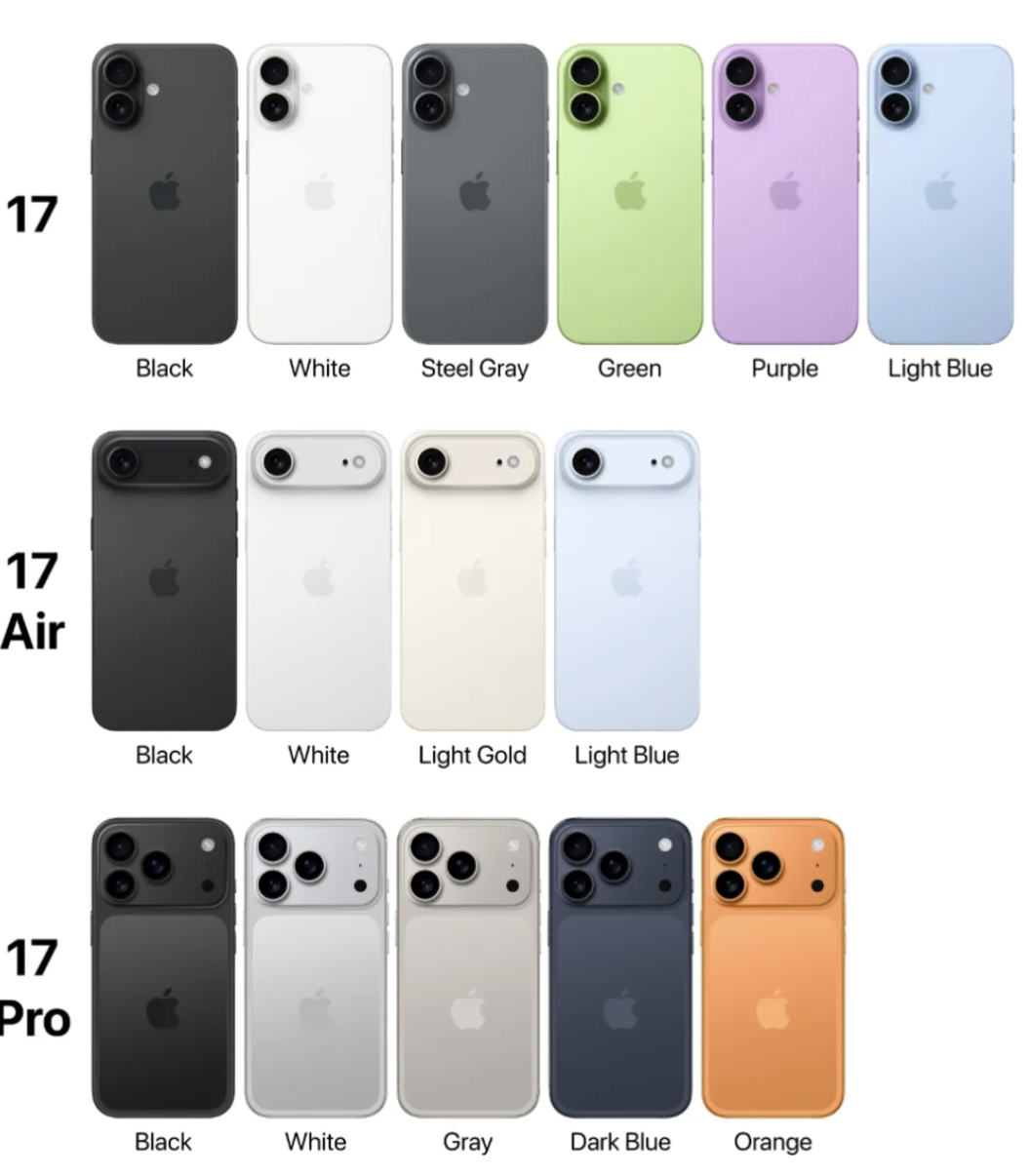 - 아이폰 17 Pro 시리즈: 티타늄 블랙, 티타늄 화이트, 다크 블루, 형광 오렌지 등 프리미엄 색상이 추가