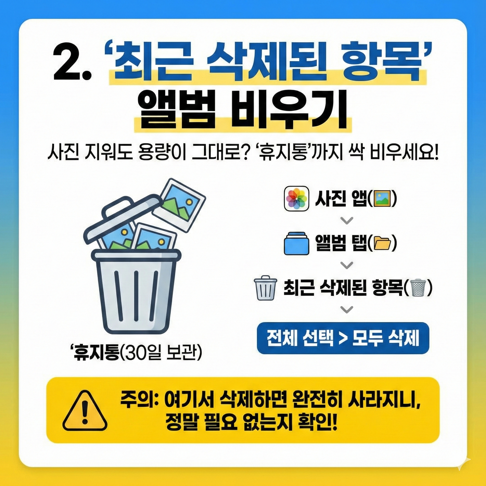 - 주의: 여기서 삭제하면 사진이 완전히 사라지니, 정말 필요 없는 사진인지 꼭 확인하세요!