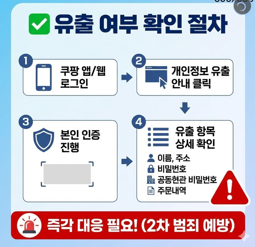 | 유출 확인 방법 | 쿠팡 앱 로그인 → 유출 안내 배너 클릭 |