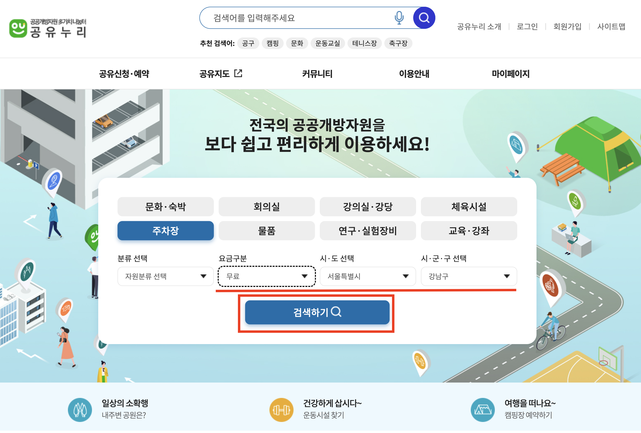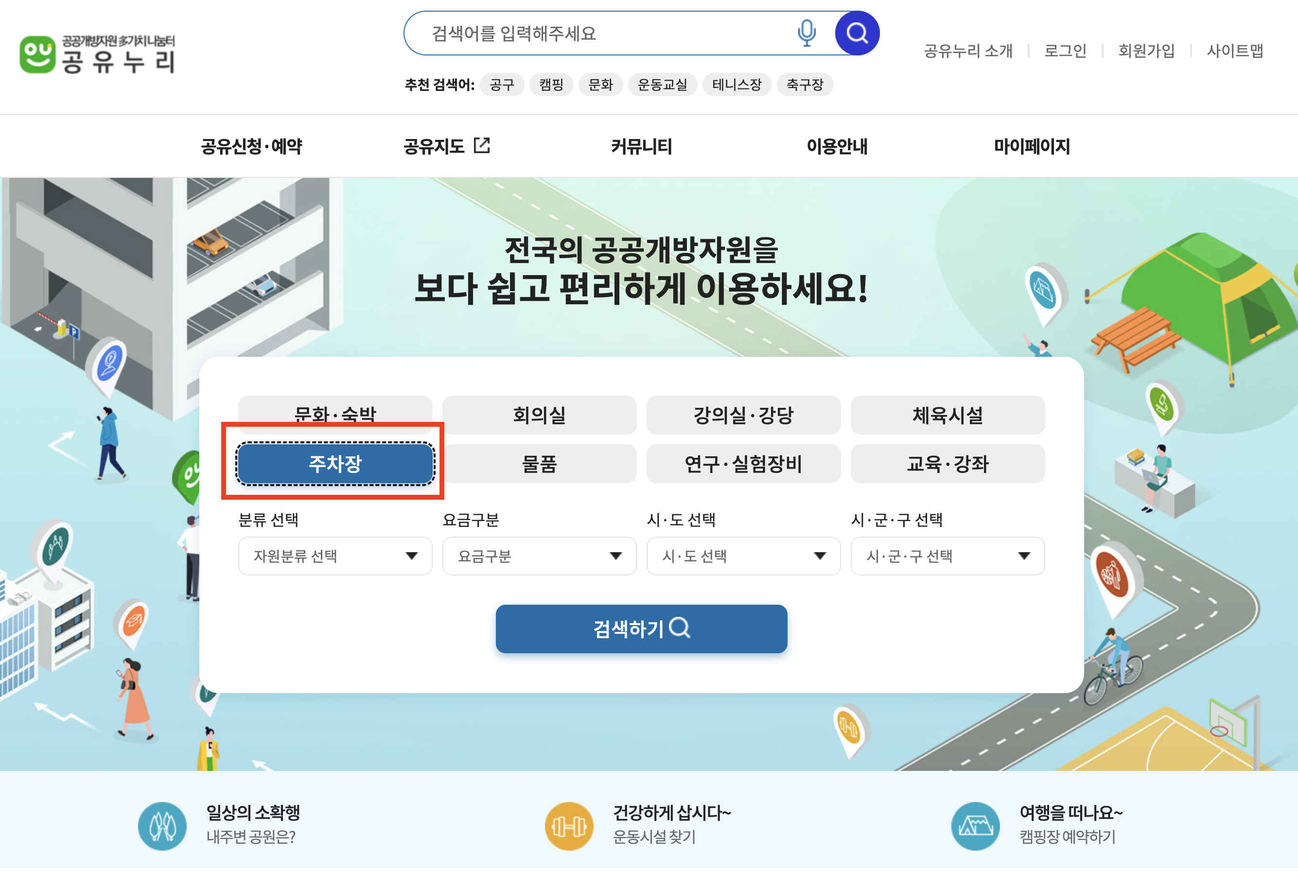 상단 메뉴에서 ‘공유자원 찾기 → 개방주차장’ 선택