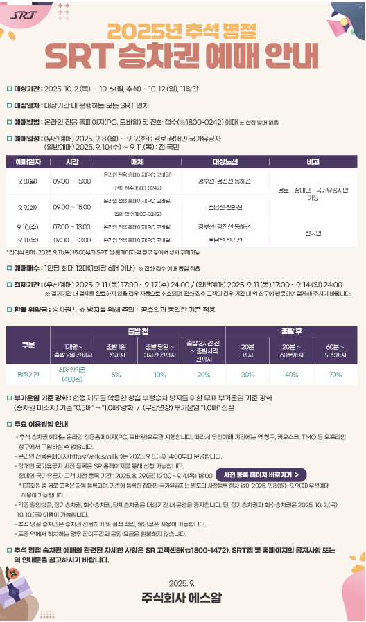2025년 추석 SRT 승차권 예매는 온라인 전용으로 진행되며, PC·모바일 SR 홈페이지와 SRT 앱, 그리고 **전화(1800‑0242)**를 통한 예매가 가능합니다.