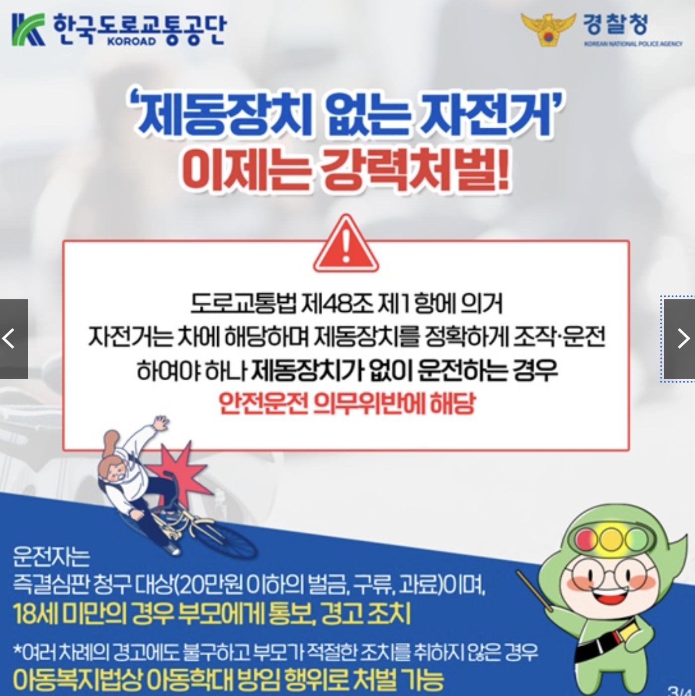 브레이크 없는 자전거는 언제 어디서든 단속 대상이므로 절대 도로에선 타면 안 됩니다.