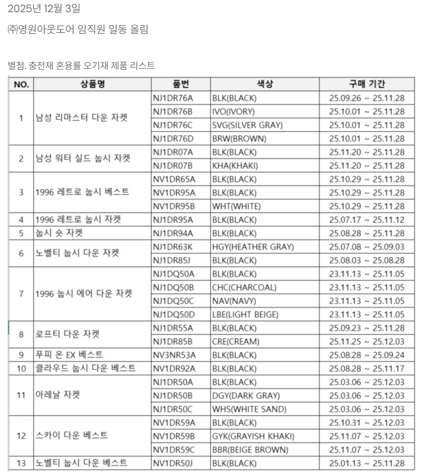 | 1 | 남성 리마스터 다운 자켓 | NJ1DR76A~D | BLACK, IVORY 외 | 25.09.26 ~ 25.11.28 |