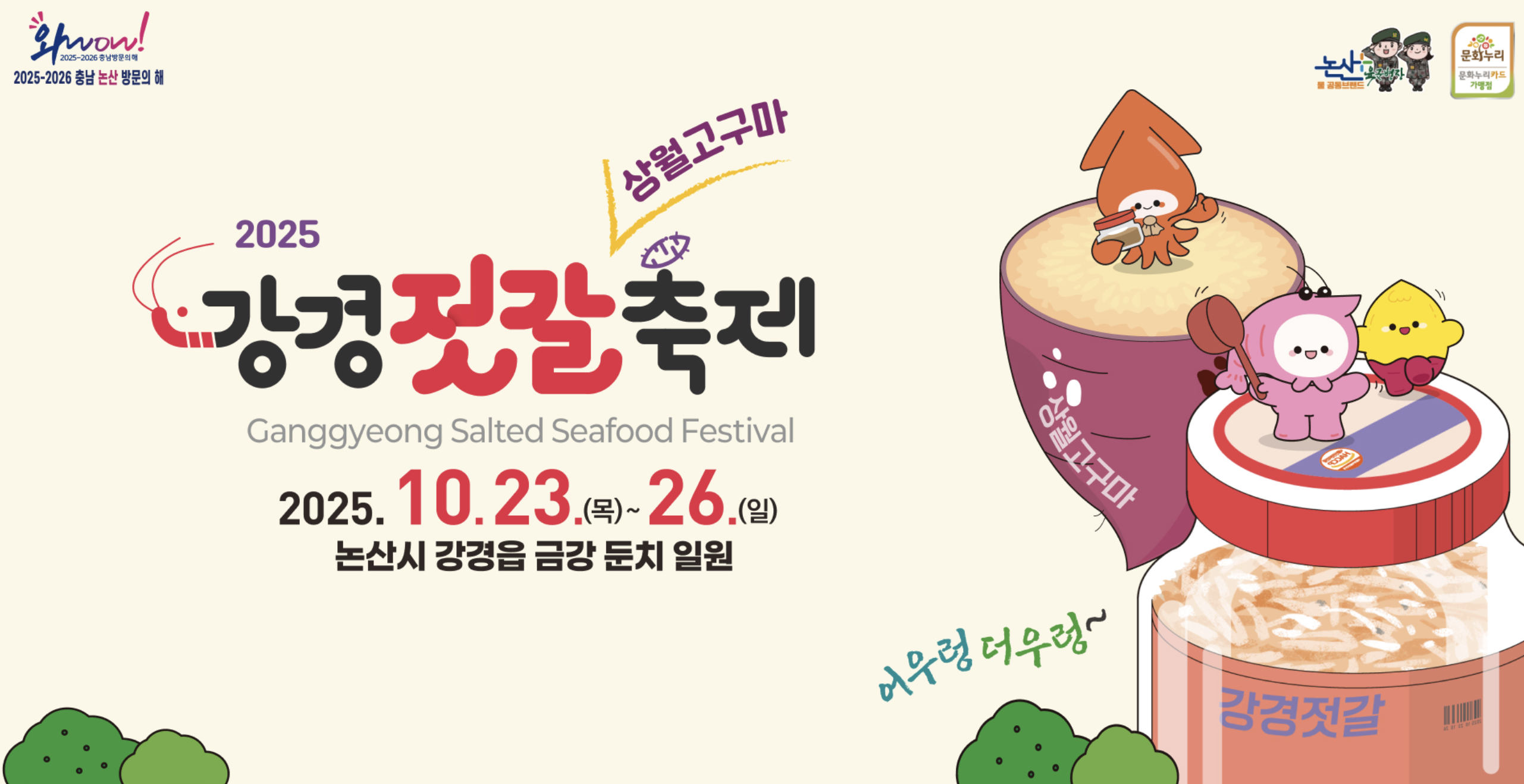 올해 강경젓갈축제는 10월 23일(목)부터 10월 26일(일)까지 총 4일간 진행되며, 행사 내용도 더욱 풍성해졌습니다. 아래에서 축제 일정과 프로그램, 연예인 라인업까지 정리해 드릴게요.