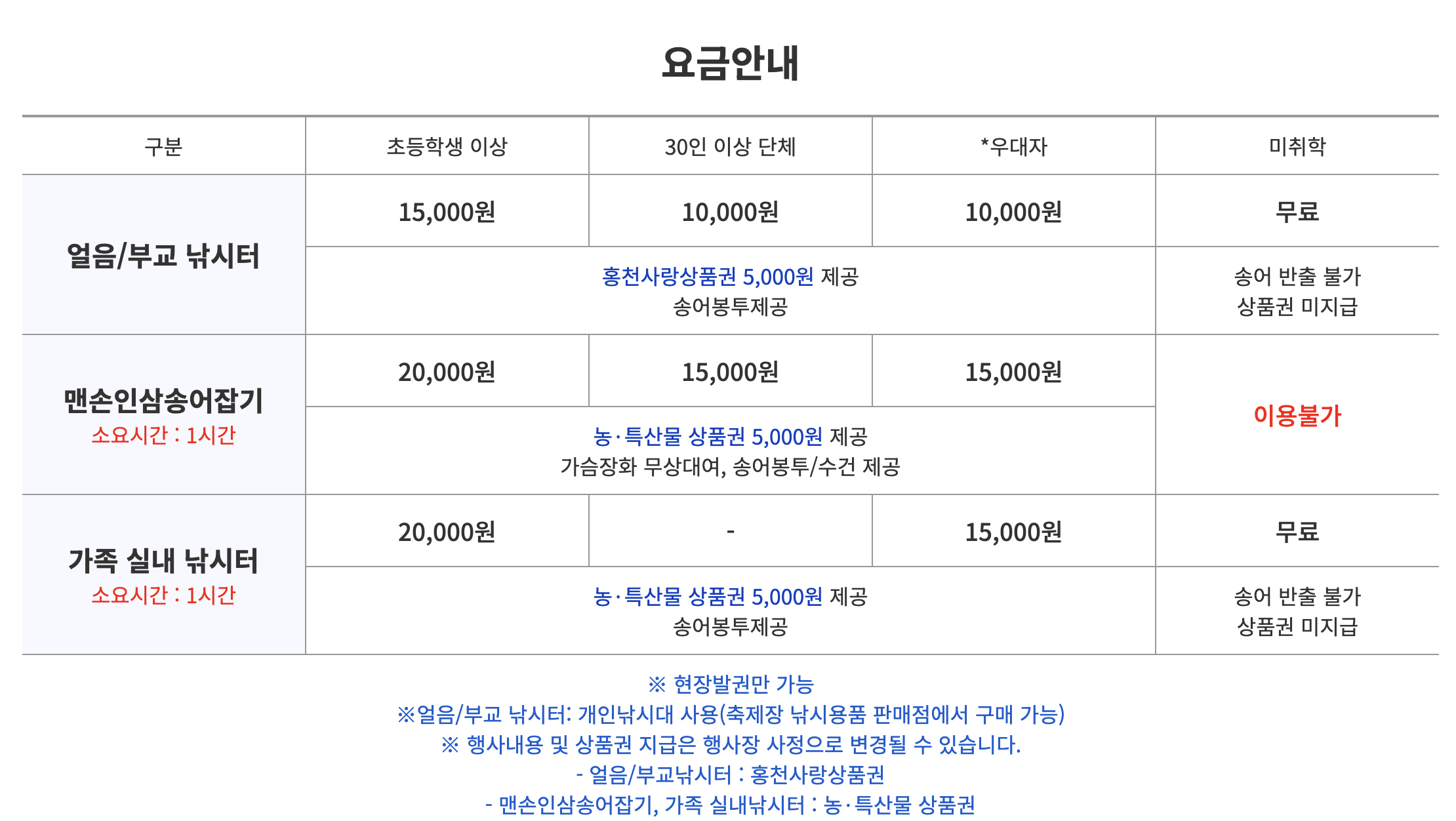 | 얼음/부교 낚시 | 초등학생 이상 | 15,000원 | 홍천사랑상품권 5,000원, 송어 봉투 |